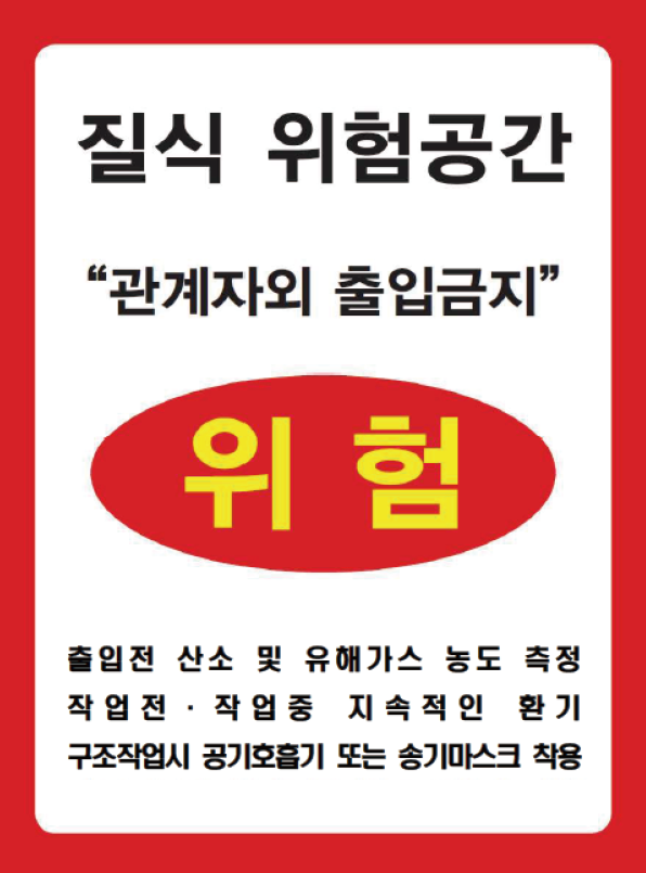 파악된 밀폐공간에는 관계 근로자가 아닌 사람의 출입을 금지하고 질식위험이 있음을 알리는 표지를 부착하여야 합니다. - 산업안전보건기준에 관한 규칙 제622조