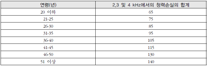 | 표 2 | 정기건강검진에서의 청력손실경계치(dB)