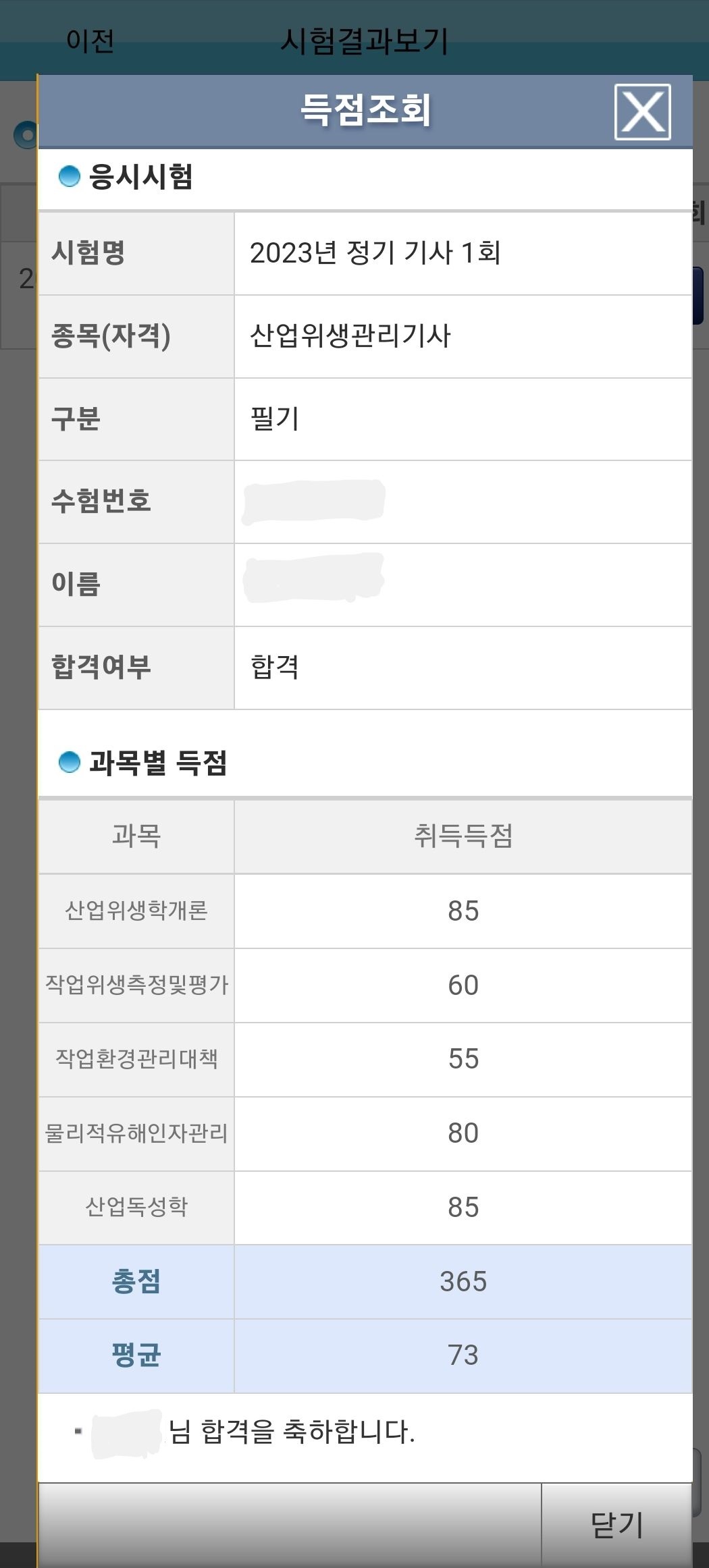 큐넷에 들어가 보면 필기 합격부와 성적을 조회할 수 있다. 작업환경관리대책이 55점으로 아슬아슬했으나 평균점수 73점으로 가뿐하게 필기 합격~~ 이제 실기시험이 남았다. 실기도 제발 한 번만에 합격하길!