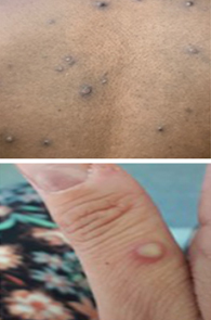 엠폭스 증상 중 이 발진은 대체로 반점부터 시작하여 여러 단계로(반점→구진→수포(물집)→농포(고름)→가피(딱지))로 진행되며 초기에는 뾰루지나 물집처럼 보일 수 있으며, 통증과 가려움증 동반하기도 함.